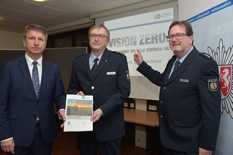 Kreis Höxter (TKu). „Vision Zero – Keiner kommt um, jeder kommt an!“ - Diese Botschaft soll Leben retten und die Menschen wachrütteln! Bei der Bekanntgabe der Verkehrsunfallstatistik für den Kreis Höxter stand die „Vision Zero“ erneut im Mittelpunkt. „Vision Zero“, das ist der Wunsch und die Vision, keinen Verkehrstoten mehr zu haben. Jeder Getötete im Verkehr sei einer zu viel, hieß es von Landrat Michael Stickeln bei der Pressekonferenz zur Bekanntgabe der Unfallzahlen in der Kreispolizeibehörde Höxter gemeinsam mit Polizeihauptkommissar Markus Tewes (Leitung Direktion Verkehr) und Polizeidirektor Christian Brenski (Abteilungsleiter der Polizeidirektion). Die Zahlen zeigten zwar einen erfreulichen Rückgang bei den Verkehrsunfällen, jedoch betonte Stickel die Notwendigkeit, weiterhin Maßnahmen zur Verbesserung der Verkehrssicherheit zu ergreifen.